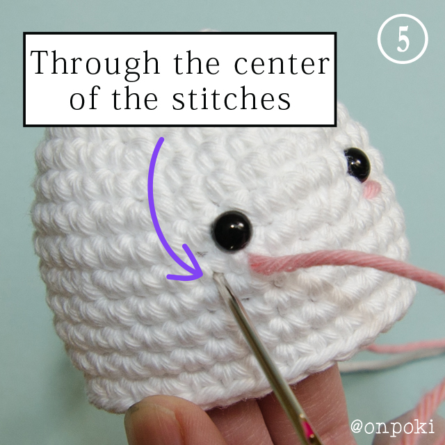 Cheeks: Make them with the pink yarn. Between rounds 10 and 11, leaving 4 spaces between them -Image 5-. Insert the needle with the pink colour yarn from inside out, just under the eye, and insert it again a space away.