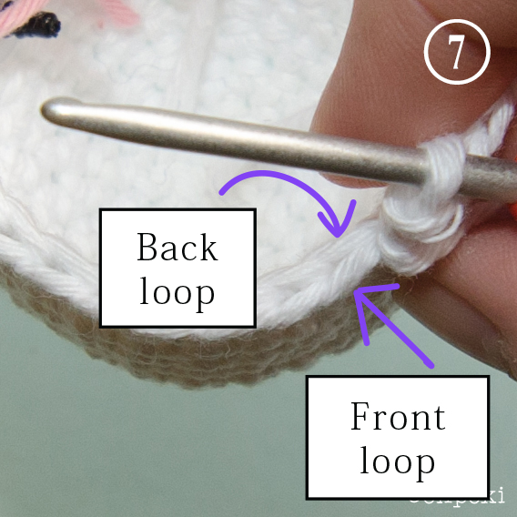 Work all the stitches of the next round in the front loop only -Image 7- * Back loop and Front loop *.