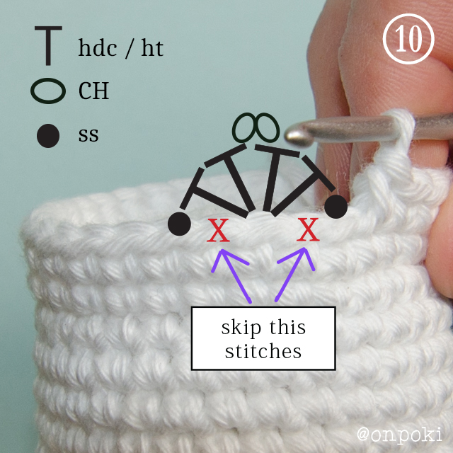18) [Make 1 ss, skip the next stitch, <2 hdc , 2 CH, 2 hdc>, skip the next stitch] x 8 *We will need to make the last ss on the first stitch of this row *